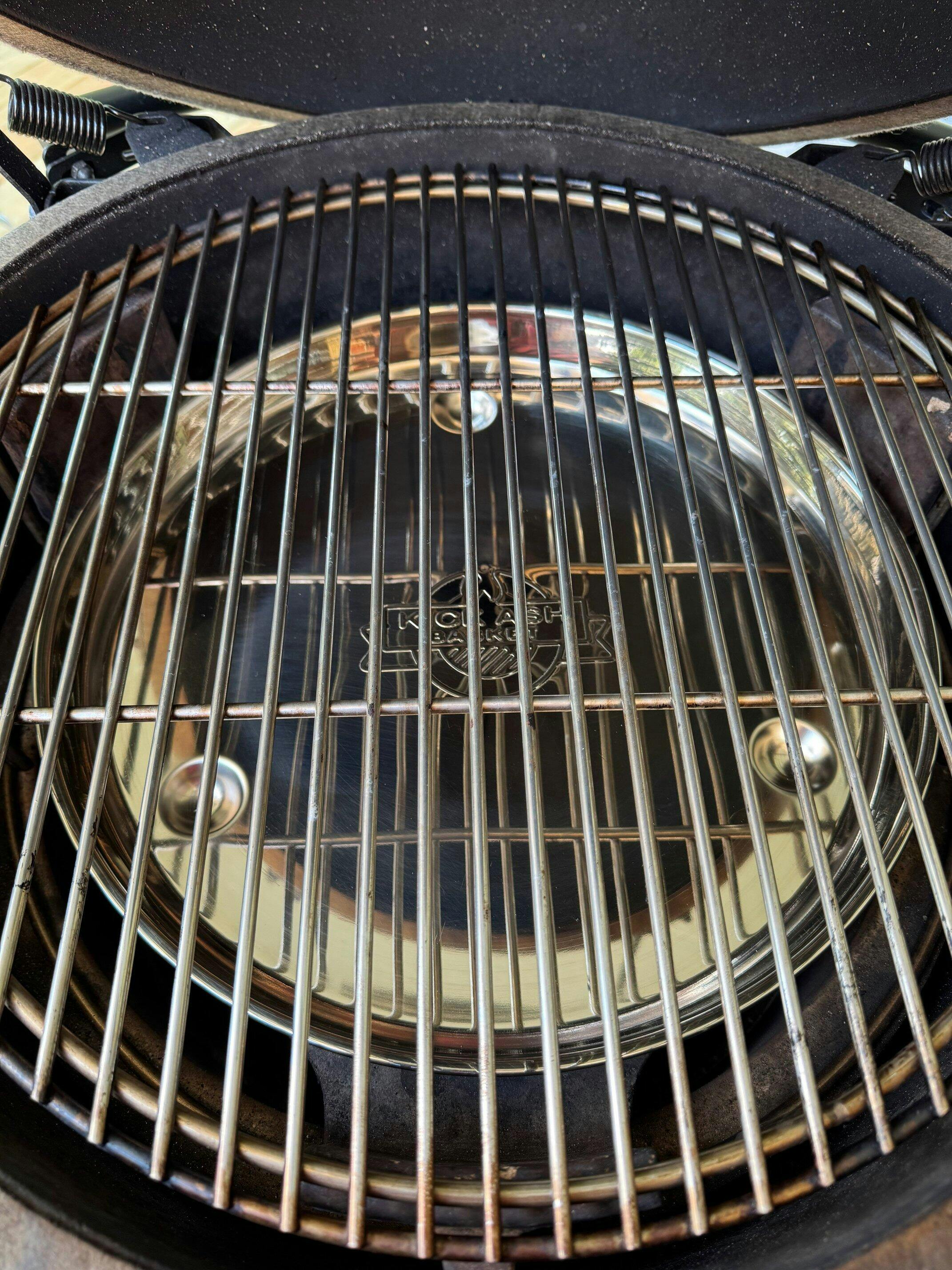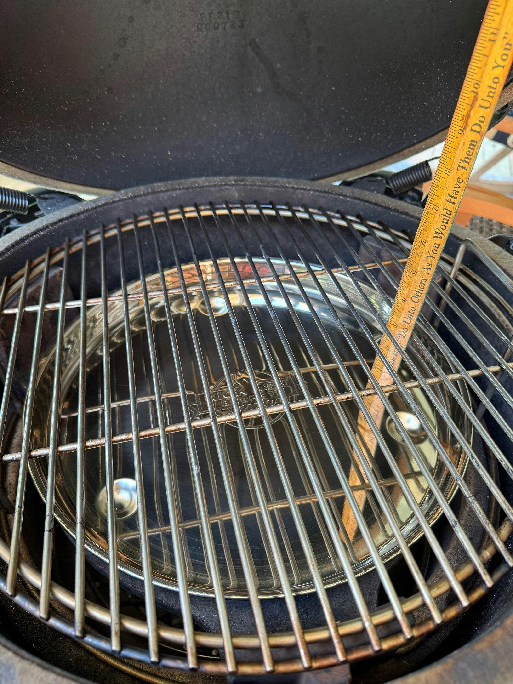 This 14" Kick Ash Drip Pan fits perfectly on my BGE plate setter/ ConvEGGtor heat deflector. It covers the round part without extending past it so the airflow isn't blocked. The pan is heavier than I expected! Great quality, very sturdy, no warble to it at all. I especially like the integrated round "feet" that keep it from sitting flat on the ceramic which keeps the drippings from burning. That's what sold me on this one rather than other brands. Even though it's easy to clean, I press a sheet of aluminum foil into it for super easy cleanup. Plenty of clearance (3") from the bottom of the pan to the grid. So glad Atlanta Grill Company had it in stock! Super fast shipping. Ordered on Sun Aug 3 and I was grilling with it Aug 6! I expect this pan to last for years. No regrets.