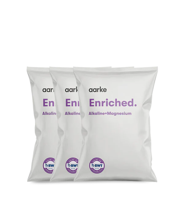 The Enriched Filter Granules are our upgraded, mineralisation filter option. On top of making your water cleaner and tastier by reducing chlorine and heavy metals, they also add magnesium mineral and turn your tap water into alkaline water through increased pH value. Made exclusively for the Aarke Purifier technology, the granules in the bag are poured into the Purifier’s refillable water filter cartridge.Created in collaboration with BWT, one of the world’s leading water technology companies. Each bag filters up to 31,7 gallons of water and lasts up to 8 weeks.