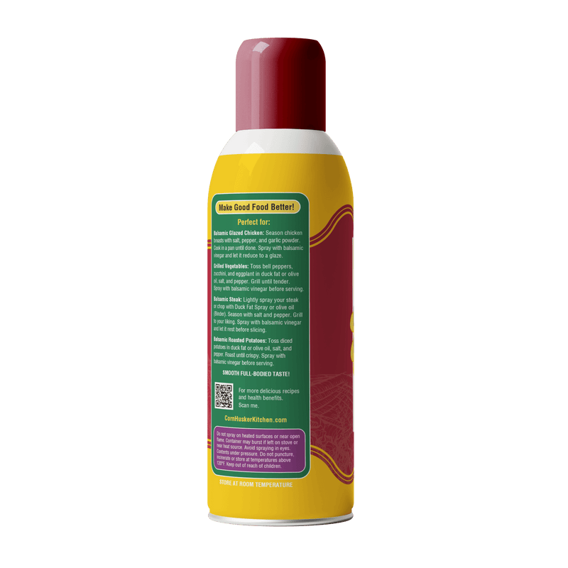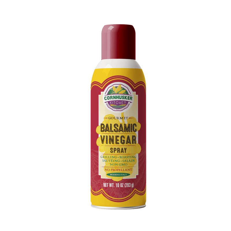 Cornhusker Kitchen’s Gourmet Balsamic Vinegar Spray is a 10-ounce recyclable can with 566 servings per every can. Every spray contains .50 grams of vinegar.