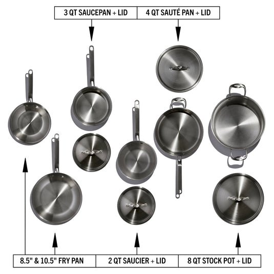 This set includes the 8.5" and 10.5" fry pans, 2 quart saucier with lid, 3 quart saucepan with lid, 4 quart sauté pan with lid, and 8 quart stock pot with lid.