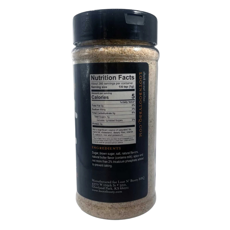 Ingredients: Sugar, brown sugar, salt, natural flavors, natural butter flavor (contains milk), spice and not more than 2% tricalcium phosphate added to prevent caking.