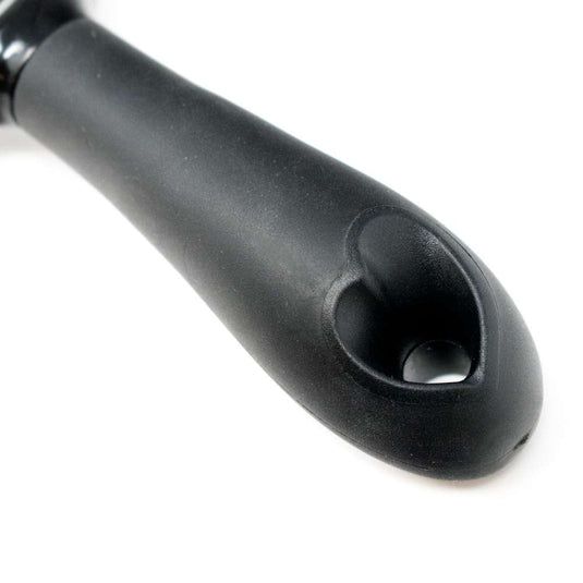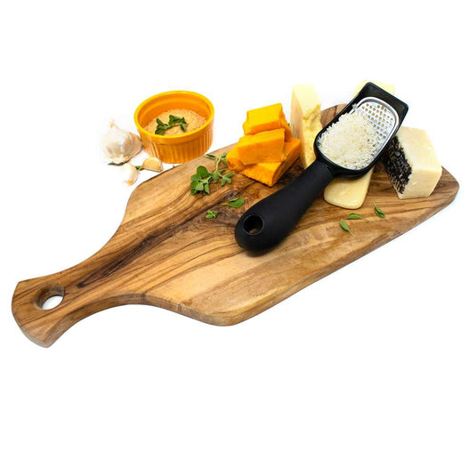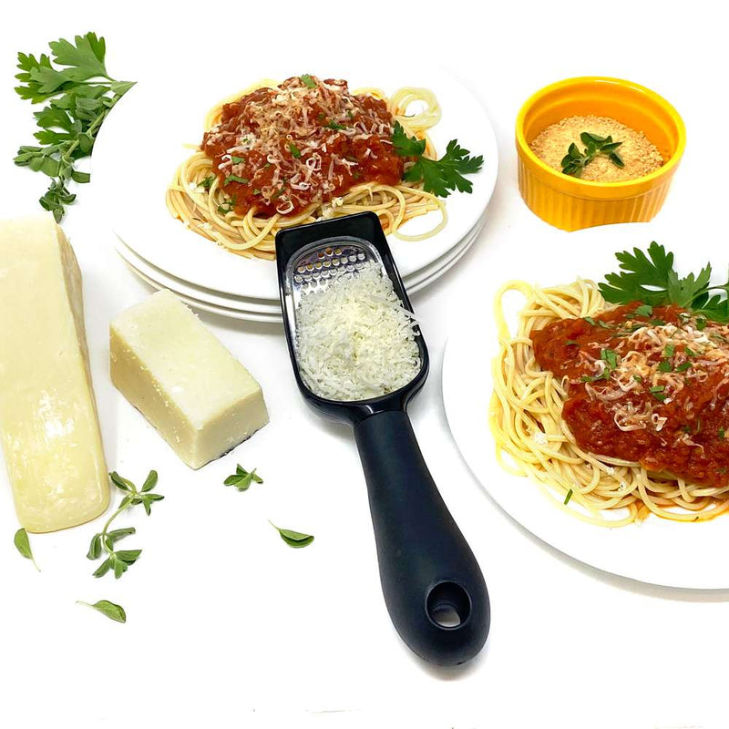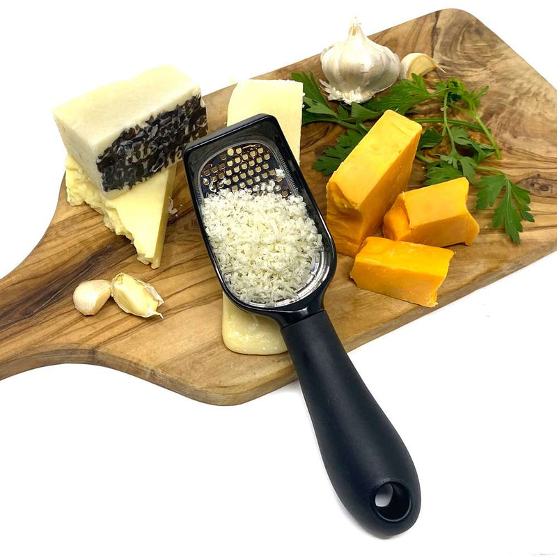 Curved spoon shape with walls catches cheese as you grate. Then sprinkle and distribute where you want the cheese to go. Less waste and mess.